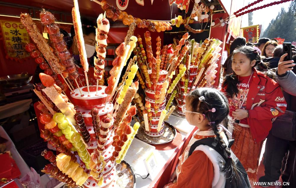 | أناس يشترون حلوى "تانغهولو"، وهي حلوى صينية تقليدية تعد من ثمار الزعرور أو الفواكه الأخرى وتغطى بطبقة من السكر، في أحد معارض المعابد في العاصمة الصينية بكين |